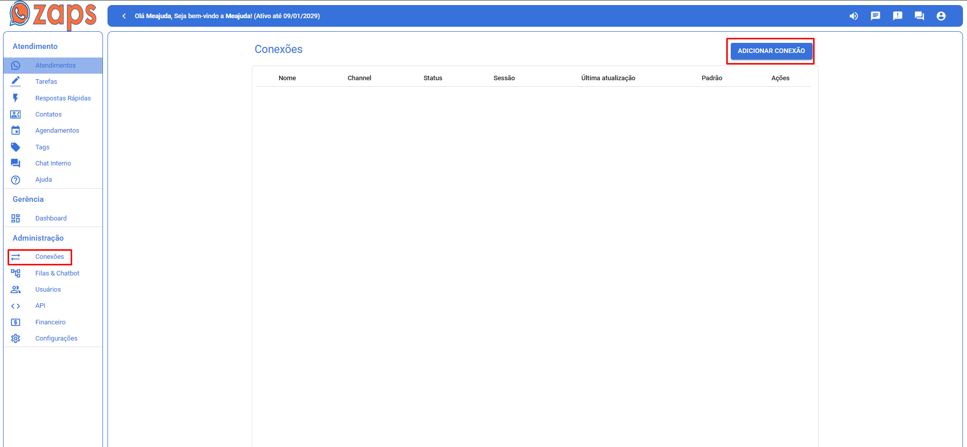 Importante: O acesso, a criação e o gerenciamento de conexões são funcionalidades restritas a usuários com perfil de Administrador. Essa medida garante a segurança e a integridade dos canais de comunicação oficiais da sua empresa.