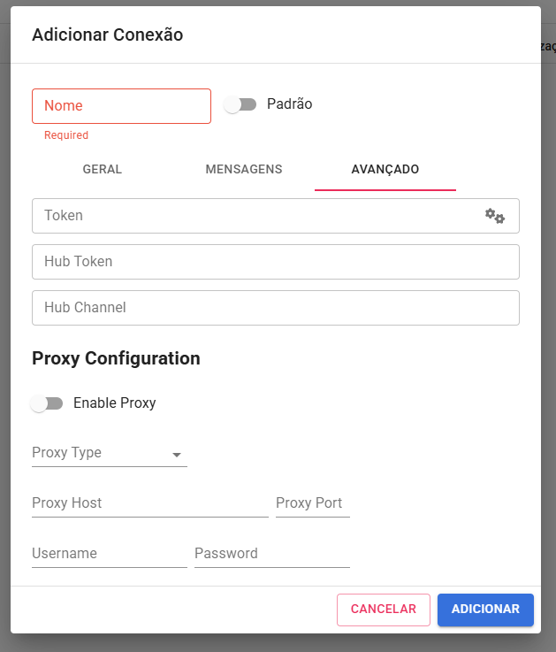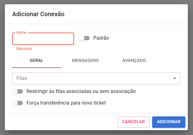 Ao clicar em "ADICIONAR CONEXÃO" na tela principal, uma janela de configuração se abrirá. Esta janela é organizada em abas para facilitar o preenchimento de todos os detalhes do seu novo canal de atendimento.