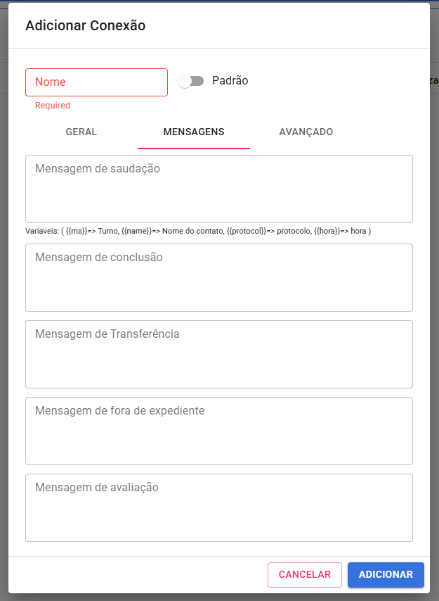 {{name}} (nome do contato) e {{protocol}} (número do protocolo) para deixar as mensagens mais pessoais e informativas.Esta aba contém configurações técnicas. Geralmente não precisam ser alteradas para o funcionamento padrão.