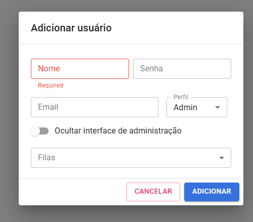 admin ou user).Ao clicar em "ADICIONAR USUÁRIO", uma janela se abrirá para o cadastro das informações e permissões do novo membro da equipe.