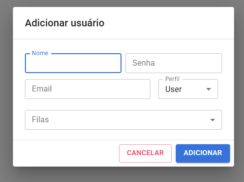 Filas: Aqui você seleciona a quais filas de atendimento este usuário terá acesso. Ele só poderá ver e interagir com os tickets das filas que forem marcadas aqui.