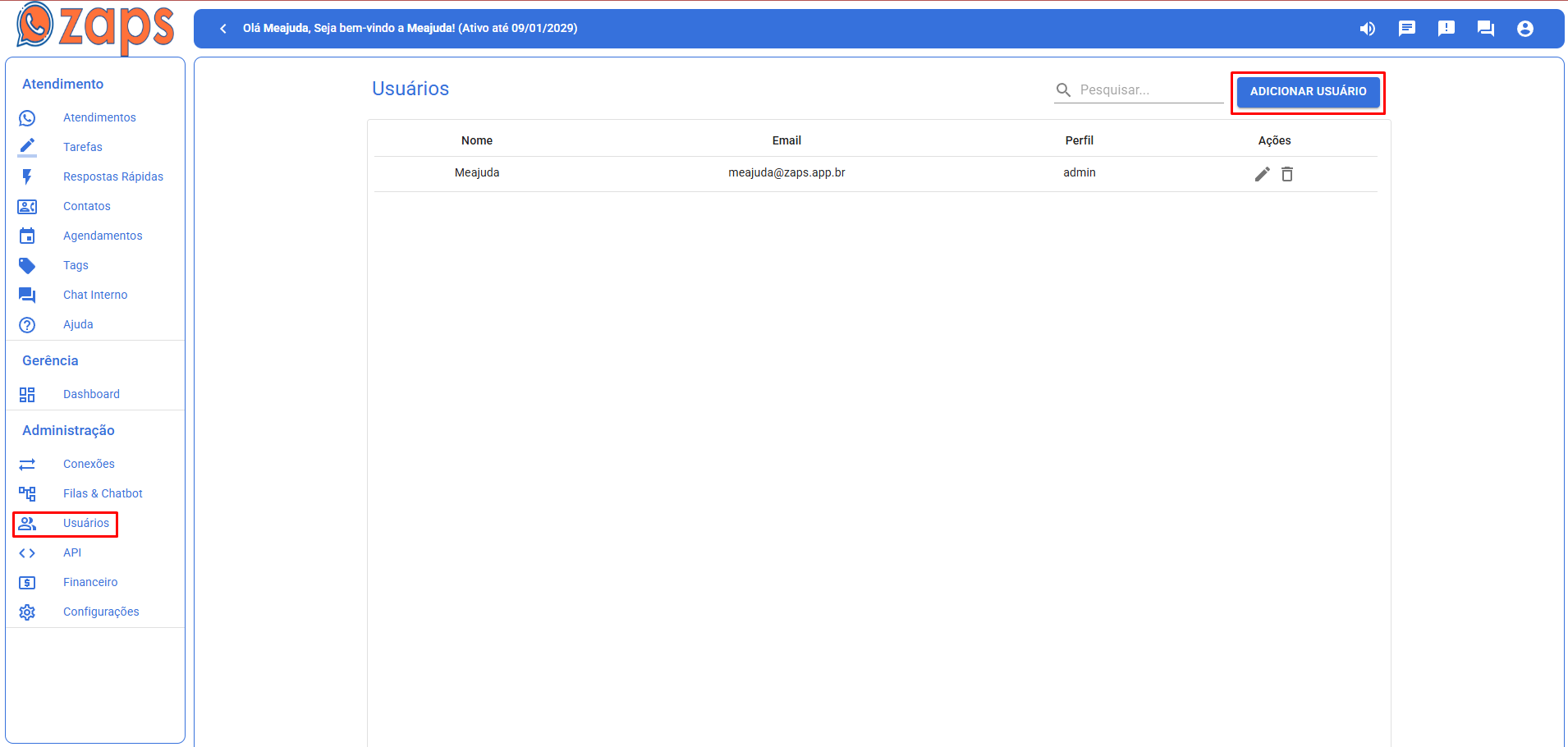 O módulo de Usuários é onde você gerencia todas as pessoas que terão acesso à plataforma Zaps. Aqui é possível adicionar novos membros à sua equipe, definir o que cada um pode ver e fazer, e associá-los às filas de atendimento que criamos no Módulo 1. Um gerenciamento de usuários bem feito é essencial para a segurança da informação e para a organização dos seus fluxos de atendimento.
